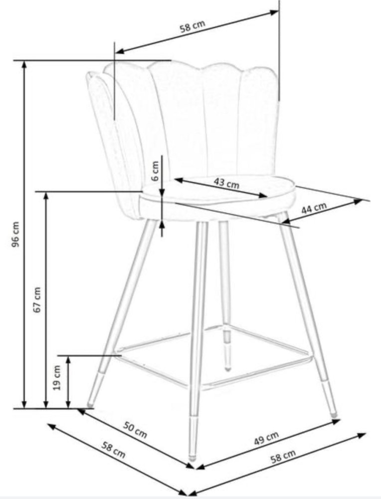 Nízká stolička H-106 je návrhem do kuchyně. Barová židle s výškou sedáku 67 cm se perfektně hodí ke kuchyňským stolům a umožní vám vytvořit dokonalé místo pro konzumaci jídel. Nízká barová židle je čalouněna jemnou šedou sametovou látkou. Podnož barové židle je vyrobena z černé práškově lakované oceli se zlatými konci nohou. Spojovací lemy jsou také zlaté barvy. Tato moderní židle dokonale zapadá do současných okouzlujících trendů interiérového designu. Barová židle H-106 má pohodlné opěradlo ve tvaru mušle, které je navíc zdobeno vertikálním prošíváním. Vyžaduje vlastní montáž.