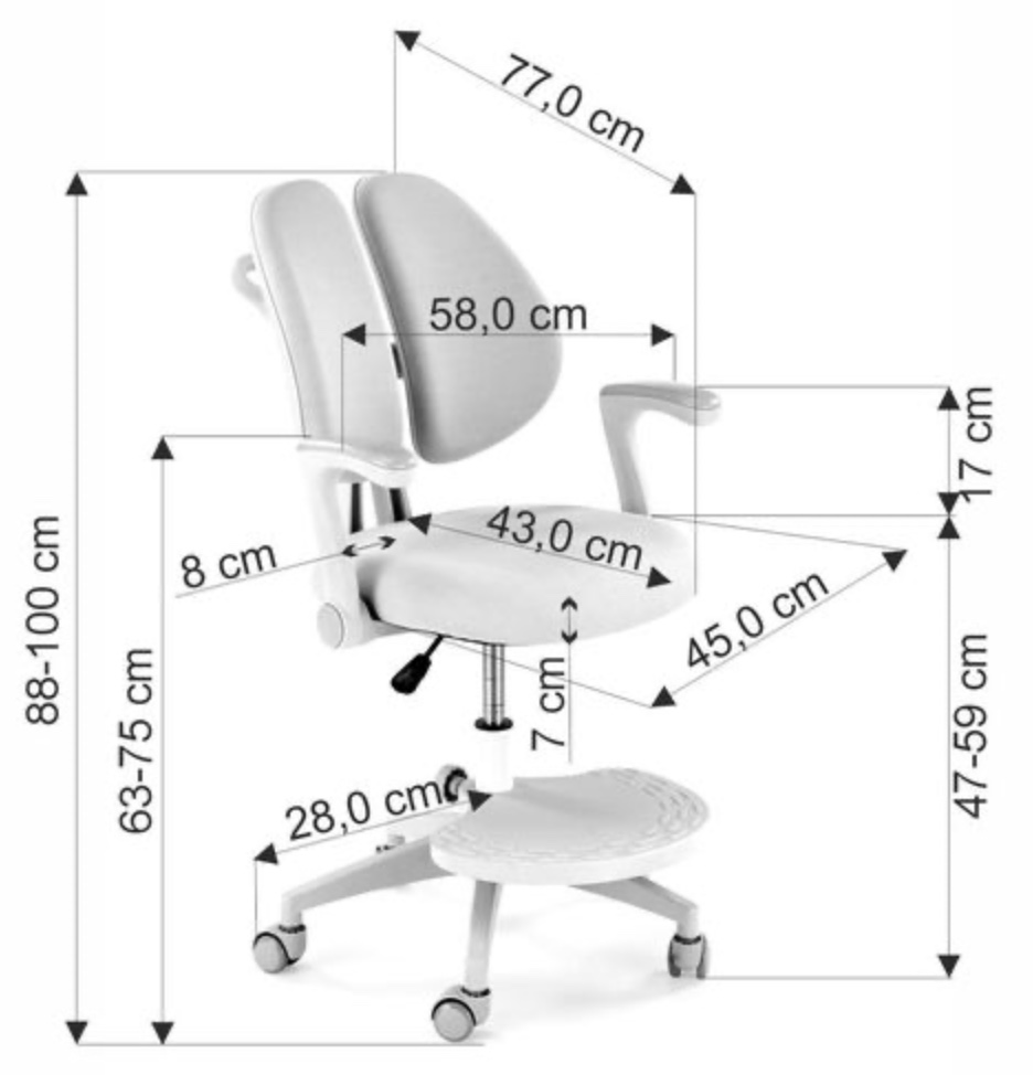 Díky těmto funkcím lze židli PANCO snadno přizpůsobit potřebám dítěte, poskytuje ergonomickou podporu a pohodlí při každodenních činnostech.