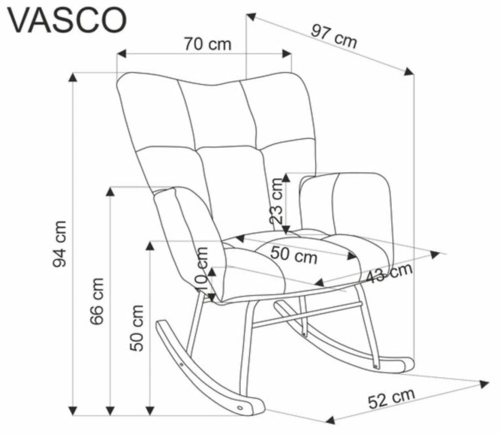 Model křesla VASCO je návrh adresovaný lidem, kteří hledají jedinečná řešení. Pohodlný sedák a opěrák čalouněné látkou NEA zaručují příjemný zážitek při používání, základna na ližinách umožňuje jemné houpání a dodává ještě větší relaxaci. Promyšlený design židle zajišťuje maximální pohodlí. Správně profilované opěradlo a vysoké područky zajišťují pohodlí a stabilitu, což se promítá do spokojenosti uživatele. Vyžaduje montáž.
