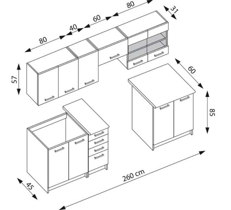Horní část obsahuje 4 skřínky. Hloubka všech horních skřínek je 31 cm. Spodní skřínky jsou 3 z nichž jedna je tvořena čtyřmi šuplíky. Hloubka všech spodních skřínek je 45 cm. Celková šířka kuchyně je 260 cm.